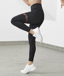 Opaque, stretch fabric. Deep waistband with inner pocket. Squat-proof. Fine mesh panels on front and back thigh. Laser cut panels at lower calves, front and back. Tombo tear-out label.