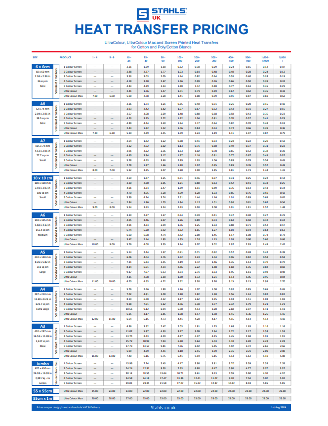 *If applying to everyday apparel, choose Standard Screen Printed or UltraColour Transfers. If applying to Sublimated Garments, choose SubliBlocker Screen Printed or UltraColour Transfers.